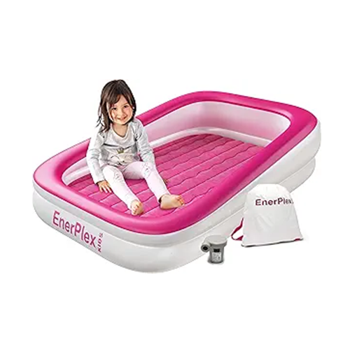 EnerPlex Kids Inflatable Travel Bed with High Speed Pump, Portable Air Mattress for Kids on The Go, Blow up Toddler Travel Bed with Sides – Built-in Safety Bumper - Pink