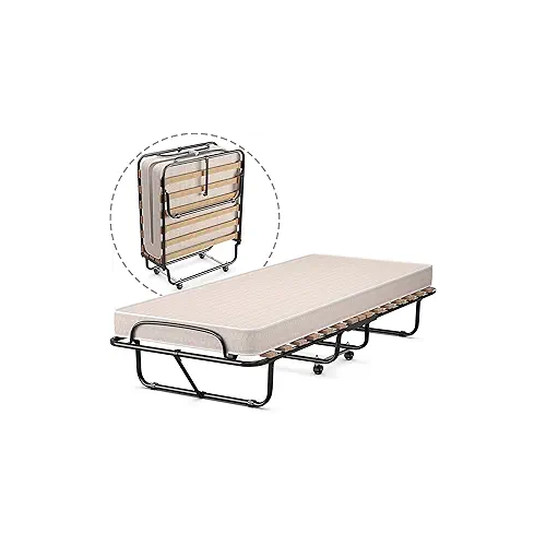 The Giantex space-saving foldable rollaway bed mattress is a versatile and convenient solution for accommodating guests or providing a comfortable sleeping space. This portable rollaway bed mattress is designed to offer both functionality and comfort. Constructed with a sturdy and heavy-duty reinforced steel frame, this rollaway bed mattress is highly durable and resistant to collapse. The solid wooden slats provide exceptional support and ensure a high weight capacity of up to 265 LBS. To further enhance safety, the bed is equipped with anti-falling bars on both ends to prevent the mattress from dropping.