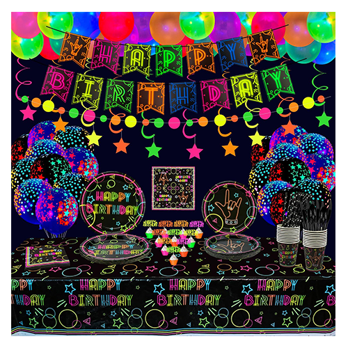 The colorful neon circles and star rings design on the black background will make your birthday glow in the dark party ideas vibrant and bright colors. Reliable Materials – We provide you glow in the dark party ideas with high-quality natural latex balloons that can be reused. Sturdy thick paper for the banners, hanging swirls, cake topper, plates, cup, and straws, non-toxic, durable to use. Quality thick plastic material for tablecloth made, knives, fork and spoons, lightweight and portable, waterproof, and durable.