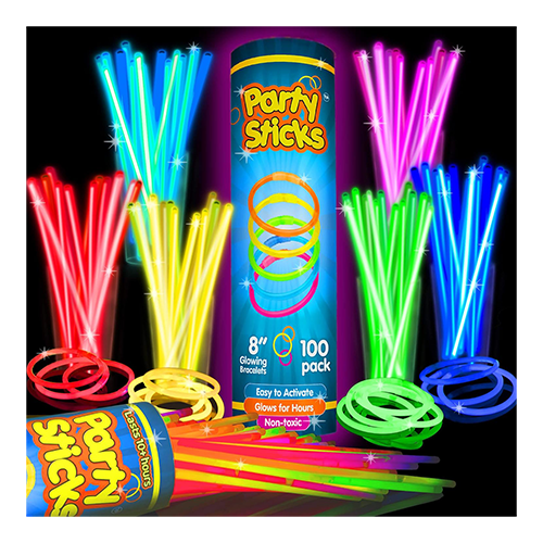 The safety promise. Safety is our top priority at party sticks. We work hard to ensure all our products meet the highest standards.us-tested. We always keep an eye out for the latest and greatest glow products, and partner with the best glow manufacturers to put them in your hands.100% nontoxic glow products. Our glow sticks, glow toys and glow decorations are nontoxic and safe for ages 3+. Store glow products in a cool, dry place. 100. Glow sticks in assorted colors,100 connectors, nontoxic, waterproof, for ages 3+,lasts 10-14 hours.