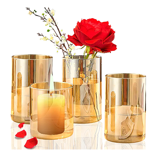 You have the freedom to mix and match the six tall Gold vases for centerpieces (4 x 6 inches) and six small vases (3.1 x 5.1 inches) included in each pack, allowing you to create eye-catching centerpieces in any way you like. Our ornamental cylinder vases are made solely of crystal-gold-colored glass without the use of acrylic or plastic. Our gold flower vases for centerpieces can be filled with water, gemstones, flowers, candles, and more to elevate the look of your home and office decor, parties, weddings, fiestas, and other events.
