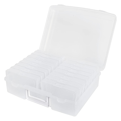 The ideal method Photo organizer Box for and storing important photographs, craft supplies, and office supplies the 4×6 photo cases maintain order in your home or workplace. Snap-tight closures safeguard the contents and safeguard your family photos. Larger items can be stored with the additional depth. 16 4″ x 6″ photo cases are included; each case can hold up to 1600 4″ x 6″ photos, making them easy to use and carry around. Dimensions of the exterior box 1 by 14.8 by 12.0 inches. Dimensions of the Photo Case Size 4.75 by 6.70 by 1.23 inches. Strong and able to bear loads—not easy to break. For storing loose photo prints, the novel inks photo cases and the larger keeper are ideal.