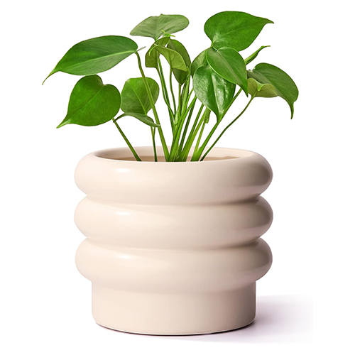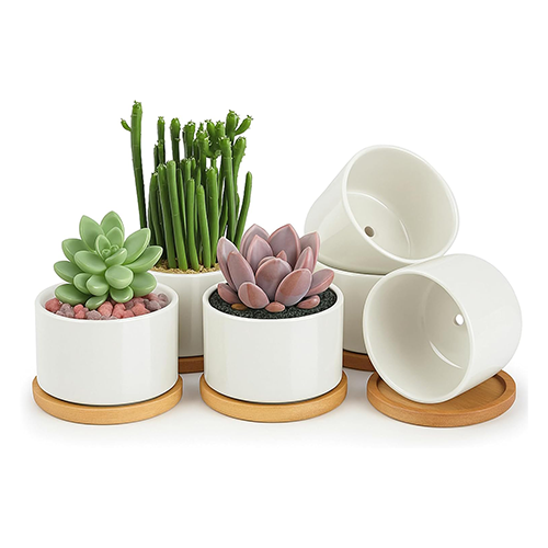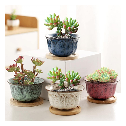 Many indoor Planters for succulents growers discover that watering their plants every 14 to 21 days keeps them healthy. Textured planters with a distinctive shape are succulent planters. The matte finish on the ceramic pots helps them stand out. The plant pots have wooden bases that can be used as coasters or trinket dishes in addition to being planters.