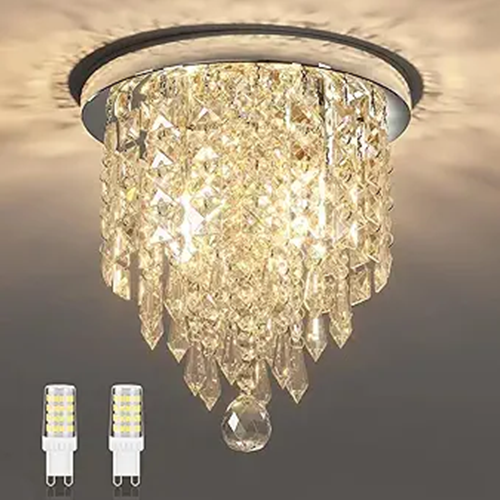 The special feature is energy efficient, AC power source and control by touch system. Product also has 2 LED light source and 110volts pass through the 8.7inche crystal chandeliers that’s gives the warm color of light. Small bathroom chandeliers have multi shade color like transparent crystal, silver metal and the model of the chandelier is220CDD. Total dimensions of bathroom ceiling light fixtures are 8.7″L x 8.7″W x 10.4″H. The crystal flush mount ceiling light has A-US style plug format that transfer 40 watts power and no batteries are required. The quantity of light emitted by a LED crystal ceiling that is measured in terms of its luminance flux.