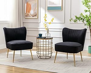 With its plush velvet fabric and sleek metal legs, this tufted accent chair leans toward a glam appeal. Its frame is built of solid rubber wood for a mid-century contemporary design in your living room or guest room. This living room Modern accent chairs set of 2 is simple to put together, comes with a full complement of supplies, including wrenches, and only requires 20 minutes.