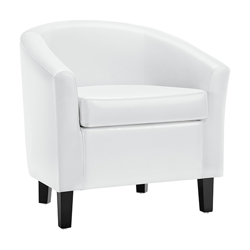 Perfect Size: This barrel-shaped white leather accent chair has a soft foam-padded seat, a sturdy wooden frame, and a luxurious-looking imitation leather covering. Having four sturdy wood legs that can support a high weight of 300 lbs. Easy Assembly: Only minor assembly is necessary.