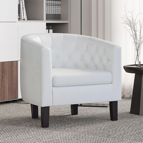 When you need a piece of practical and fashionable furniture, this white leather accent chair comes in helpful because it is sturdy and comfortable. This white barrel chair has a sense of luxury thanks to its faux leather coating. With its attractive carved back and built-in armrests, it is the ideal club chair for your living area, bedroom, and guest room, as well as the office and hotels.