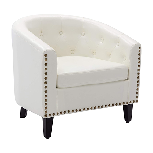 All you have to do is open the box, remove it, and sit down. You can quickly enhance the beauty and style of your living room or bedroom with the help of this informal bucket chair. You can sit comfortably thanks to the curved sides, dense foam padding, and premium PU leather upholstery. The white barrel chair is a real style sophisticate that has been seen in affluent clubs, Victorian mansions, and more for generations; today, they are equally at home in libraries with wood paneling as they are in urban studio apartments.
