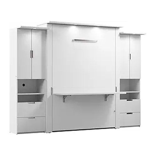 Bestar Lumina Queen Modern Wood Murphy Beds with Desk- Adjustable White Murphy Bed with 2 Cabinets