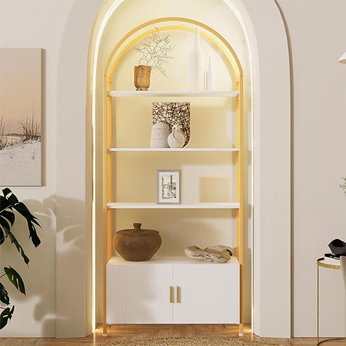 This product is of Jehiatek that was founded in 2020 with the intention of producing goods of the highest caliber and aesthetic appeal. This arch bookcase has flexible base legs. Its adjustable base legs allow for smooth grounding on uneven surfaces and it is non-slip and well-suited to safeguard your floor. It has both door and floor mount. It is rectangular shaped arch bookcase with tiered shelf type. It has 11-inch diameter with 71-inch height and 31.5-inch width. Its weight is 48 pounds and is available in three colors i.e., gold, rustic brown and white. This product has free standing installation type.