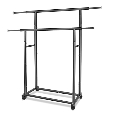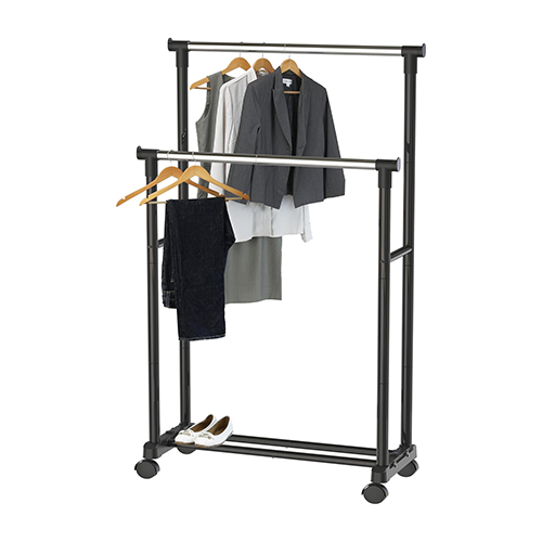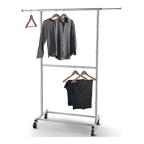 Here is a straightforward way for extra clothing storage. It is constructed from heavy-duty steel and has a stylish black and chrome finish.sturdy design and simple assembly. excellent dorms for students. Its measurements are 36″L x 16.5″W x 64″H. A range of clothing hanging rod from the Double clothing hanging rod Portable Series are designed to offer the utmost convenience. The ideal option for modest flats and living areas is made possible by the light and compact design. Strong construction with a mix of durable metal and flexible plastic parts. Finished with a timeless Black paint as well as a sophisticated Chrome top to complement any environment. Wheels or casters are included for portability and simple transporting.