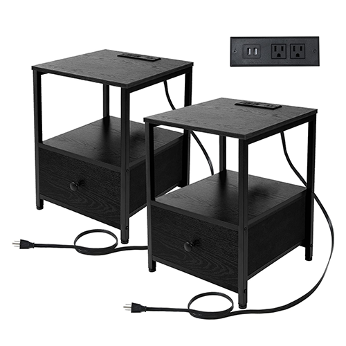 Continuity and glamour In tandem: The black end table with drawer and charging station’s sturdy and level structure is provided by the metal bars that span its square tube legs. The nightstands are made stronger by their top surface of E1 grade particleboard. Tabletop load capacity: 44 lbs. This accent furniture’s strong and stylish design gives it an outstanding purpose. The pair of black nightstands can be used as a nightstand for children, a couch end table, a sofa side table, etc.