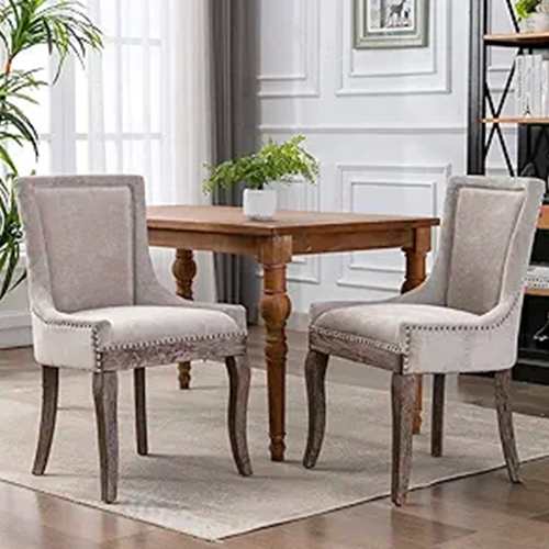 Superior handcrafted craftsmanship like curved legs, embellished nailheads, and a partially wrapped wood frame, tight high back with cozy padded seat 17.7″ are main features of beige upholstered dining chairs; solid wood frame in distressed condition with solid rubber wood legs makes it more strong. Fabric for dining room chairs is breathable and it is quite comfortable. Simple assembly is required as no tools are needed and only leg assembly is needed.