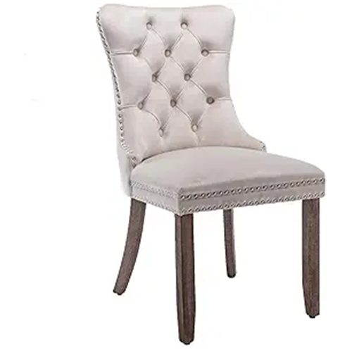 The tufted dining room chair has a sophisticated and glamorous appearance, with delicately tufted buttons and studded nailhead trim that add timeless elegance to any dining room, living room, lounge room, or workplace setting. The fabric for dining room chairs has smooth velvet with a buttoned design back and stud trim, as well as stitching detail around the clean edges, is nice to the touch but durable. Clean, precise stitching is used to complete the edges. The backs of kitchen chairs have distinctive chrome metal knockers where you can hang towels or other items. Dimensions of the product are 37.4″ H x 23.6″ W x 19.7″ D, 19.7″H from the seat up, Each chair weighs 22 lbs.