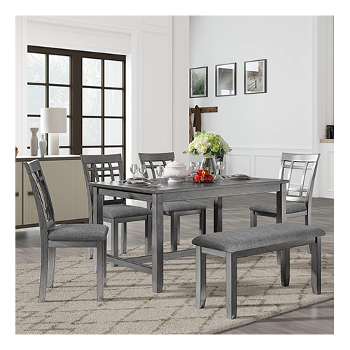 Farmhouse design set is old-fashioned rustic appearance this striking dining table and bench set offers your dining area seductive charm and a homegrown cottage look. It is finished with a retro and beautiful antique coating. Dining room set, kitchen set, and set of chairs. Set of 6 dining tables, This rectangular dining table set and farmhouse design set includes a dining table, four hardwood padded chairs, and a gorgeous dining bench that can seat your entire family.