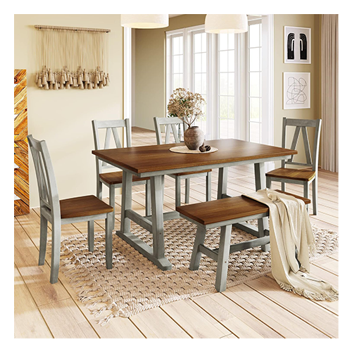 Merax 6-Piece Farmhouse Style Wood Dining Table Set with Long Bench and 4 Chairs, Walnut+Gray