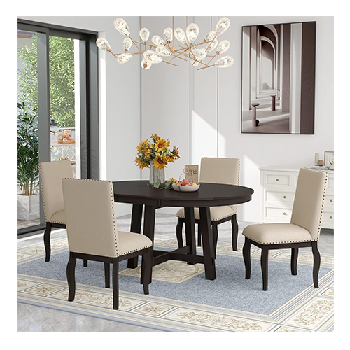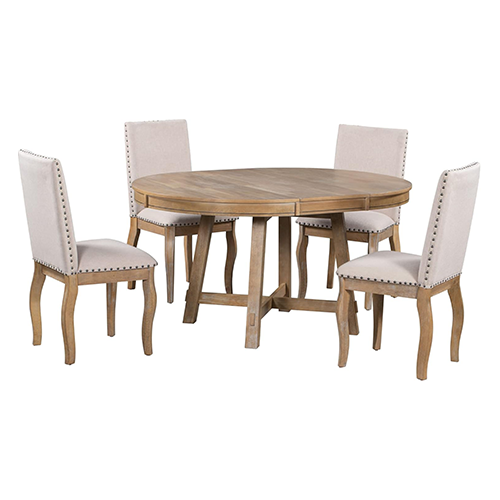 Five-piece dining room set, this five-piece dining table set conveys an elegant and temperamental mood thanks to the round surface and unique curving chair legs. The cushioned dining chairs and beautiful natural wood texture of the tabletop complement both rural and modern dining room designs. Additionally, this round extendable dining table set is adaptable to any size room thanks to the adjustable dining table length.