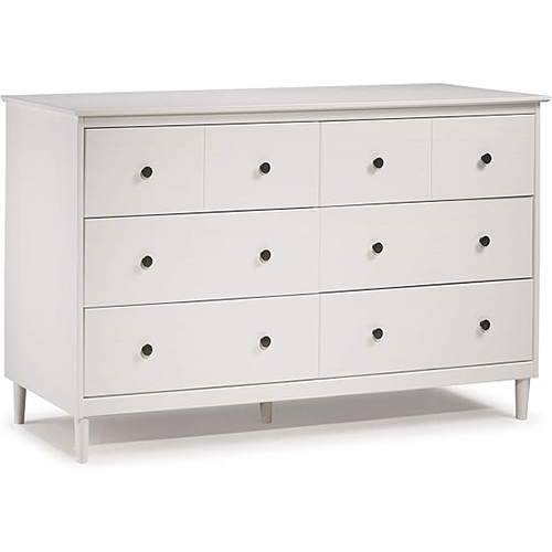 Stylish, brushed nickel hooded pulls and pine solids and MDF boards give this nightstand its long-lasting durability while bringing organization to your bedroom. White and wood dresser for long-term use, the entire dresser is painted and coated. Waterproof surface coating for simple daily maintenance. Sturdy, tapering oak legs add a sense of sophistication while being stable and safe. To help prevent tip-over incidents, stability has been assessed for safety. Large Storage Area: This white and wood dresser has a broad countertop and seven deep drawers, so there is plenty of room inside for all of your t-shirts, socks, and pants.