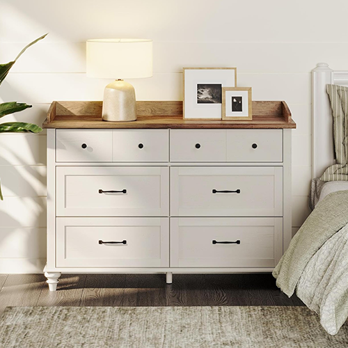 This white wide dresser can serve as a spacious and simple storage solution for your bedroom. This white wide dresser has a modern white base and a hardwood top, making it adaptable to a wide range of decor styles. Made from CARB-approved P2 particleboard. It has six large drawers for storage, all with easy-to-turn metal handles. You can put up to 150 pounds on the top of this sturdy solid oak dresser, and each drawer can support up to 35 extra pounds. This white wide dresser has a lot of storage space for clothes and linens with its six spacious drawers. The top surface could also be utilized to showcase memorabilia like photographs or ornaments. This newfound ease of organization extends to all facets of life.