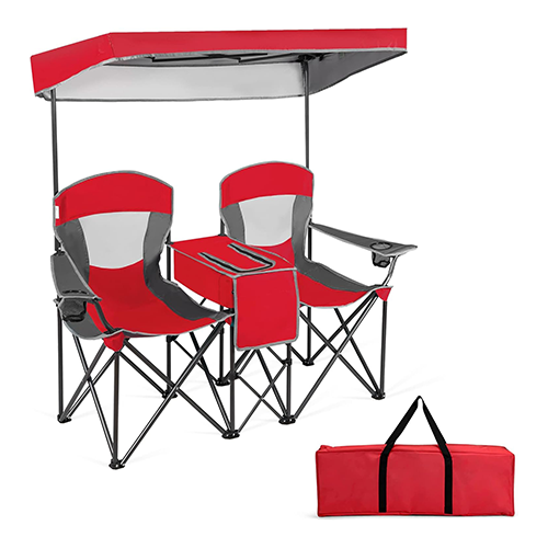 Folding chair with canopy is dependable and rust-resistant for prolonged outdoor use because it is made of breathable oxford cloth and black powder-coated steel. Each chair has superior connectors, a sturdy frame and a 265 lb. weight capacity. The chair has a retractable silver painted canopy that can be adjusted to shield the sun from any angle. The chair will offer you outstanding comfort thanks to its wide armrest, spacious, breathable seat and ergonomic design. A cooler bag is built into the central table of this chair, providing storage space and maintaining the temperature of iced beverages.