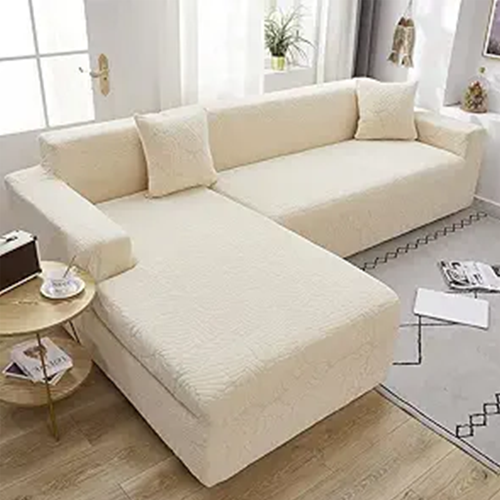 - Two sofa covers in the shape of an L, each made of 95% polyester and 5% spandex. Machine washable in cold water; do not use detergents that include chlorine; wash the towel gently to avoid twisting due to tassels.
