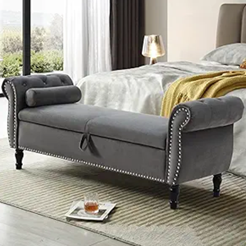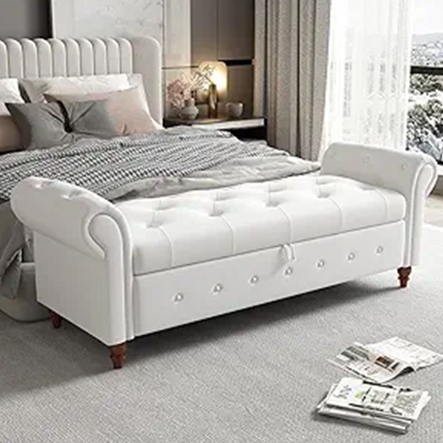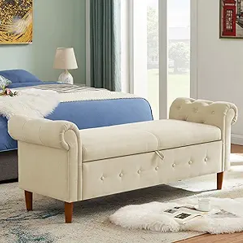 - The end of bed couch rolling arms of this end-of-bed bench with storage ottoman are tufted with buttons to give it a noble appearance.