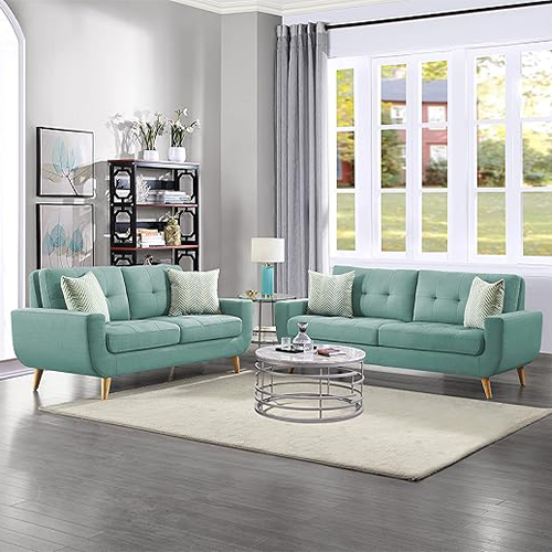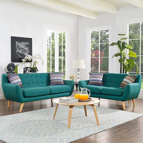 - Mid-Century Modern $1,370.25 in style. Built with a robust wood and plywood structure and covered in teal fabric upholstery, this set contains a sofa and a loveseat for the living room.