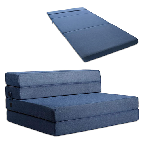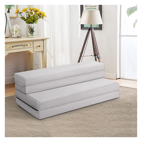 This Tri fold sofa bed comes in three sizes and is covered with a plush, machine-washable, breathable mattress cover that can be unzipped for simple cleaning. Portable mattress conveniently collapses into a coordinating zippered tote, making storing or transport simple, practical, and fashionable. The go-to travel cushion is a foam mattress with carrying handles, The KOMFOTT folding mattress, which is made of high-quality, long-lasting foam, provides 4 inches of support and is covered in a removable, machine-washable cover.