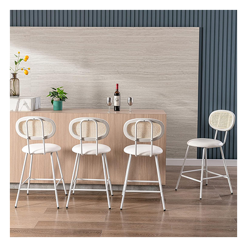 Counter Stools Rattan Back Dining Chair,Indoor Faux Leather Bar Stools Set of 4,Armless Dining Chairs with Rattan Backrest Metal Legs,Modern Counter Height Barstools for Home Restaurant White,24"