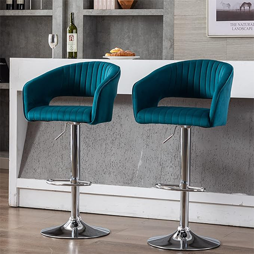 “Extra comfort”: teal bar stools can be moved and turned 360 degrees. The mid-hollow back and silver footrest can be moved to give you a comfortable place to sit while you drink your morning coffee. “comfortable design”: the unique hollow design of the back will relieve pressure on your lumbar spine, and the high-quality sponge and soft velvet will make you even more comfortable. The high-quality velvet fabric on dining chairs that can be adjusted makes them easy to clean. The modern stools for kitchen island are perfect for decorating a home bar or restaurant counter, office reception area, kitchen island, pub, or salon. They are a mix of modern and classic styles. The large silver base of these modern stools for kitchen island makes them more stable and long-lasting. Rubber rings on the bottom make it easy to move around without damaging the floor. The package has all the tools you need. It can hold about 280 pounds. Overall, a bar stool is 35.8-44 inches long “h x 20″w, seat height: 24.8-33″, seat depth: 15.7″, seat width: 15.7″, and back depth: 12.2”. If you have any questions about the chairs, please feel free to contact us. The soft velvet fabric used to cover the chair gives modern stools for kitchen island a comfortable feel. The hollow, curved backrest is made to help your back feel less tired. And a high-resilience sponge pad on a wide seat makes it soft and comfortable. Also, the structure is strong and stable because it has a good silver base and solid connections. The chair works well at both the kitchen island and the pub table. 1 2 dimensions’ style: modern style Material: velvet + silver base + wood frame Kitchen island/public house/gifts Ergonomics: yes Cushion: covered in fabric The answer is no. Teal/cream/grey are the colours. Soapy water and a towel to clean Adjustable elegant velvet bar stools