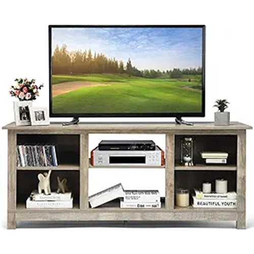 Tangkula Farmhouse Wood Universal TV Stand for TV's up to 65", Rustic TV Console Table w/Open 6 Shelves, Living Room Media Entertainment Center for 18" Electric Fireplace (Not Included) (Grey)