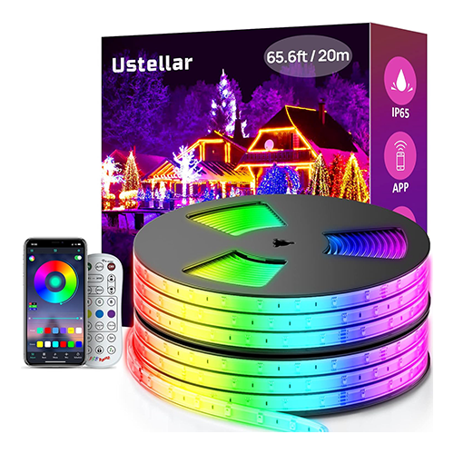 USTELLAR 65.6ft (2 Rolls of 32.8ft) LED Rope Lights Waterproof IP65 640 LEDs, 360lm Bright Color Changing Strip Light Plug-in 24V, App/RF Control Dimmable Music Sync Light Not Cuttable, Not Extendable