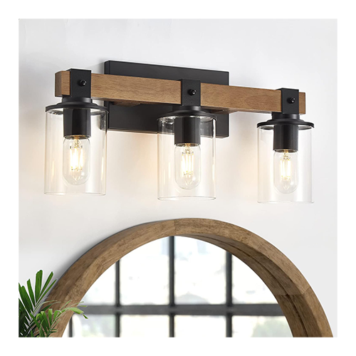 Farmhouse Bathroom Vanity Light, 3 Light Rustic Bathroom Light Fixture, Wood Bathroom Lights Over Mirror with Clear Glass Shade, Farmhouse Vanity Wall Lights for Bathroom, Living Room, Hallway