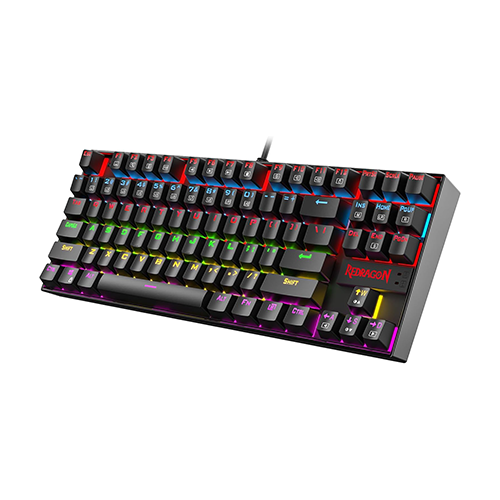 Small, compact, clicky Custom Switches on the 87-Key TKL Mechanical Gaming Redragon keyboard produce a strong, audible click sound and sharp, precise tactile feedback that is suitable for both gaming and typing. LED There are 19 different illumination modes on the Rainbow Backlit Mechanical Gaming Keyboard, plus 2 user-programmable options. Precision-engineered keycaps give uniform, crystal-clear backlighting in six different colors and six brightness settings.