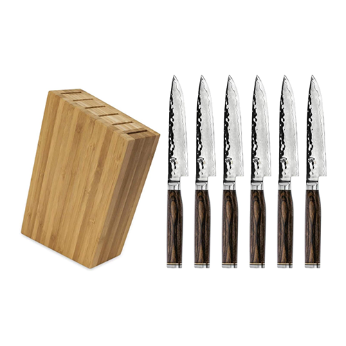 An undulating line is created near the blade’s edge where the steels meet, resembling the hamon that is created when samurai swords are tempered using the traditional clay-baking method. It contains a bamboo storage block and 6 (six) fine-edged Shun Premier Steak Knives. 69 layers total, including 34 layers on each side and Damascus cladding. Food is prepared quickly and easily with a shan-sharp 16° (32° complete) shun premier knife set. A flat-ground, double-bevel blade slithers through food. PakkaWood handles with a contoured finish in walnut. These shun knife set made by hand in Japan.