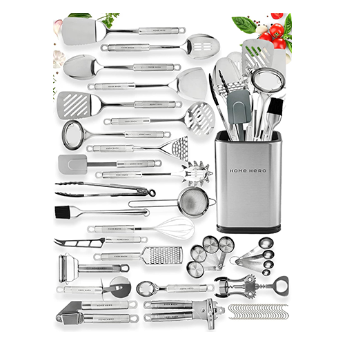Eliminate the horrible plastic from your meals forever! The days of sweating it out in the kitchen are long gone. Utensils You’ll always have the appropriate tool nearby with Home Hero, and all of your practical kitchen equipment will last for many years. Suited to any cooking, Home Hero is the best cooking utensils set you could wish for. Utensils These classic stainless steel utensil set make lovely housewarming presents because they are made of 100% stainless and silicone non-stick materials. You have everything you need to prepare delicious meals, including measuring cups, Utensils measuring spoons, a skimmer, a slotted spatula, a garlic press, a cheese knife, a tea strainer, a wine opener, a potato peeler, and more.