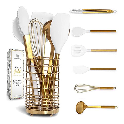 Upgrade to a modern gold and white kitchen utensil set Utensils Get rid of your outdated, mismatched utensils and replace them with this stylish set of stainless steel gold and white kitchen utensils. It includes everything you’ll Utensils need for daily cooking, baking, and serving. It also makes a chic, practical gift for anyone who has a gold kitchen decor.