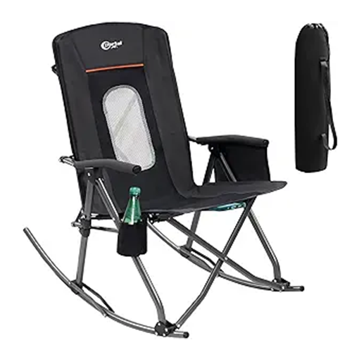 collapsible rocking chair transportable folding chair is equipped with a comfy seat and a breathable mesh panel to keep you cool on warm days. This Folding Rocking Chair frame weighs up to 250 pounds and is made of durable powder-coated steel. It also features firm armrests and a drink holder. For transportation to camp, picnics, concerts, and festivals, a carry bag with a shoulder strap is supplied with quick and simple setup.