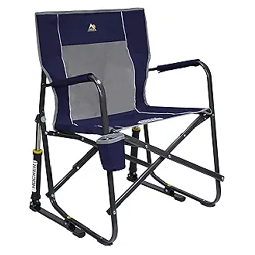 Portable rocking chairs fold flat quickly and conveniently for convenient storage and transit. Strong, powder-coated steel frame with cushioned arm rests and a built-in drink holder holds up to 250 pounds. Camping rocker frame made of durable powder-coated steel can withstand up to 250 pounds and has cushioned armrests, a mesh backrest, and a cup holder. Anywhere outside, including a patio, lawn, camping site, or tailgating, smooth rocking motion is delivered by patented spring-action folding rocking chair technology.