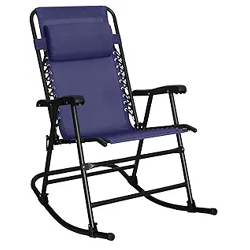 Folding Rocking chair that folds up for use outside or when are travelling. Easily collapses for storage or transportation. Your spine is supported by an ergonomic textile mesh seat with elastic cording. Sturdy steel frame with powder coating and arm rests. Use on your porch or patio at home or when travelling. Includes a comfortable cushioned head rest.
